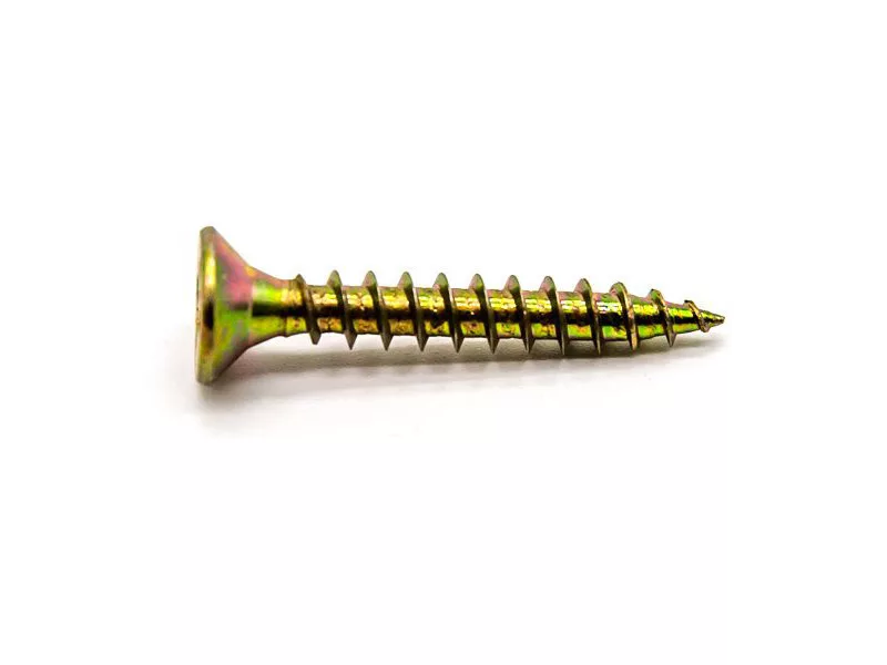 Spanplattenschrauben mit Senkkopf und Torx-Antrieb, mit Voll- oder Teilgewinde, mit gelber oder weißer verzinkter Oberfläche.
