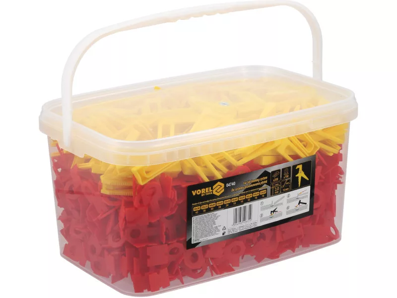 A tile levelling system that makes laying tiles quick and easy. The kit consists of 700 pieces of breakaway clips, 200 pieces of reusable wedges and pliers to make assembly easier and quicker. The system helps to eliminate surface irregularities. It is designed for ceramic, porcelain stoneware, rectified floor and wall tiles of various sizes and thicknesses in the range 7-14 mm. The system replaces traditional crosses. Prevents displacement during installation and adhesive setting, speeds up tiling with perfect joints and levelness. No additional tools are required. It can be applied to walls and floors and is easy to install for all skill levels.