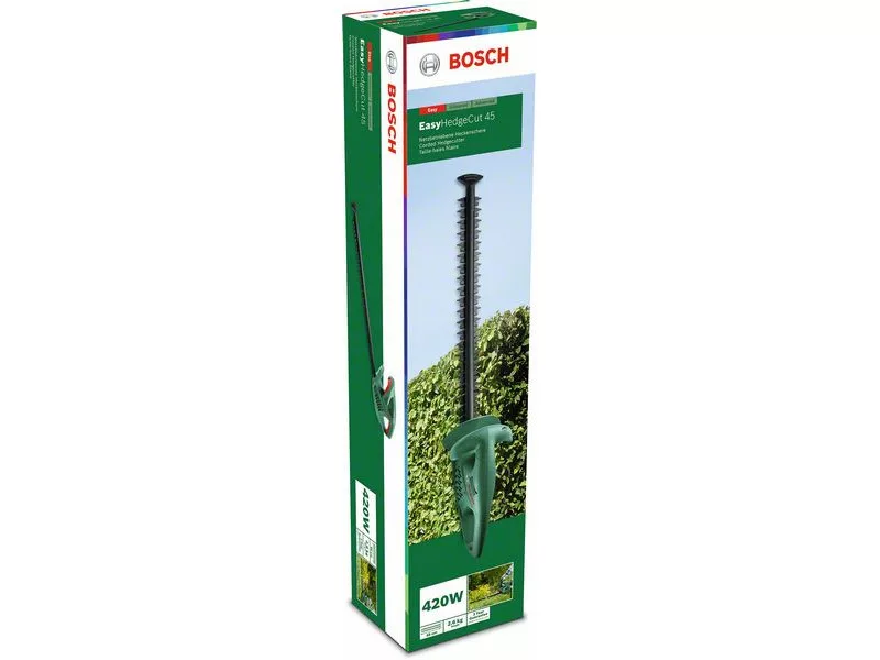 Der EasyHedgeCut 45 Heckenschneider ist hervorragend zum leichten Beschneiden und Pflegen kleiner Hecken geeignet. Mit seinem geringen Gewicht (nur 2,6 kg) und seinem ergonomischen Design ermöglicht er eine kontrollierte und bequeme Handhabung in jeder Arbeitssituation. Der Heckenschneider hat einen 420 W Hochgeschwindigkeitsmotor für schnelles und sauberes Schneiden, und mit dem 450 mm langen Messer und dem 16 mm Messerabstand können problematische Bereiche leicht erreicht werden. Ideal zum Schneiden kleiner Äste und junger Hecken, die bis zu 1,5 m hoch sind.