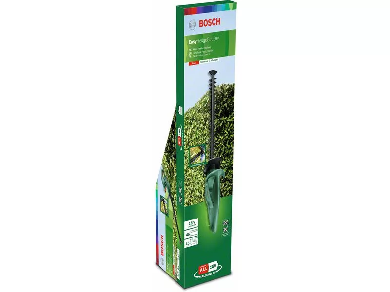 Der EasyHedgeCut 18-45 ist ideal für die Pflege und den Schnitt von kleinen und mittleren Hecken. Sein extrem leichtes (2,3 kg) und ergonomisches Design sorgt für komfortablen Einsatz in allen Arbeitssituationen und schont den Oberkörper bei längeren Aufgaben. Der 18 V Li-Ion-Akku bietet optimale Leistung, die in Verbindung mit dem Bosch Anti-Blockiersystem hervorragend für präzises, kraftvolles und kontinuierliches Schneiden ist - alles ohne störende Probleme wie Verstopfung. Die kabellose Mobilität ermöglicht freie Bewegung im Garten ohne das Risiko, das unter Spannung stehende Kabel zu durchtrennen. Dieses Werkzeug ist Teil des POWER FOR ALL ALLIANCE-Systems. Eine einzige Batterie kann eine Vielzahl von Werkzeugen verschiedener Marken betreiben.