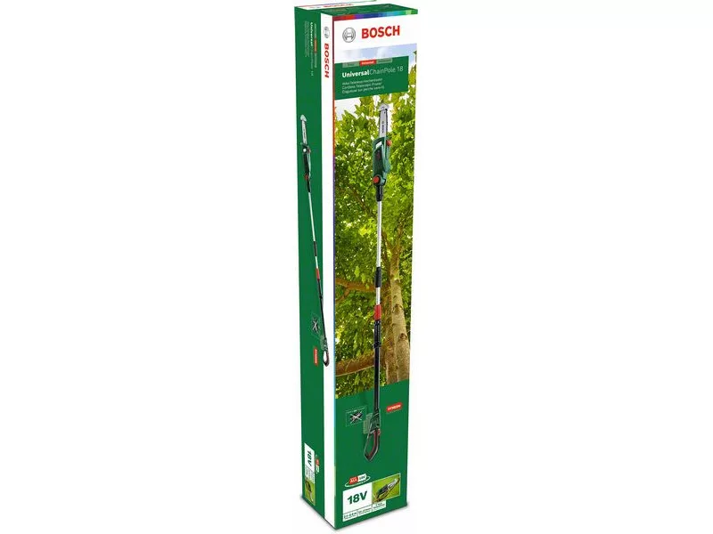 Einfaches Beschneiden von Baumästen vom Boden aus, ohne Leiter. Der UniversalChainPole 18 ermöglicht einfaches Beschneiden an sonst unerreichbaren Stellen dank des Teleskopgriffs und des schwenkbaren Kopfes. Das ausgewogene, leichte, ergonomische Design minimiert die Belastung für Arme und Schultern, während der Messerschutz und der Stachelstoßdämpfer maximale Kontrolle beim Schneiden und Untermähen bieten. Die automatische Kettenschmierung und der Ölstandsanzeiger gewährleisten einen reibungslosen Betrieb des Werkzeugs für gleichmäßige Ergebnisse. Der Akku-betriebene UniversalChainPole 18 für kontinuierliches Schneiden ohne Beschädigung der Bäume. Dieses Werkzeug ist Teil des POWER FOR ALL ALLIANCE Systems. Mit nur einem Akku können viele Werkzeuge verschiedener Marken betrieben werden.