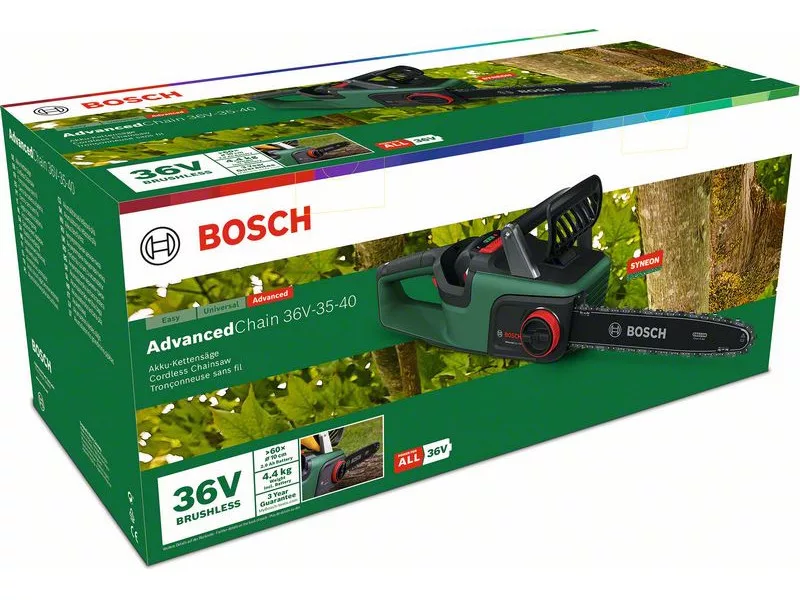 Behalten Sie die Kontrolle über Ihre Gartenpflegeaufgaben und handhaben Sie auch größere Äste und Baumstämme mühelos mit der leistungsstarken, bürstenlosen AdvancedChain 36V-35-40 Kettensäge. Störungsfreies, kontinuierliches Sägen auch in härtesten Harthölzern und Knoten dank der OptiCut Drehzahlregelungstechnologie, die Staus erkennt und das Drehmoment entsprechend anpasst. Gartenliebhaber werden das ausgewogene, leichte Handling, die komfortable Montage mit dem werkzeuglosen SDS und die Sicherheit des QuickStop-Bremssystems zu schätzen wissen. Die eingebaute Bosch Syneon-Technologie gewährleistet eine optimale Leistung bei maximaler Laufzeit. Dieses Werkzeug ist Teil des 36V POWER FOR ALL ALLIANCE Systems. Ein einziger Akku für alle 36V POWER FOR ALL Werkzeuge.