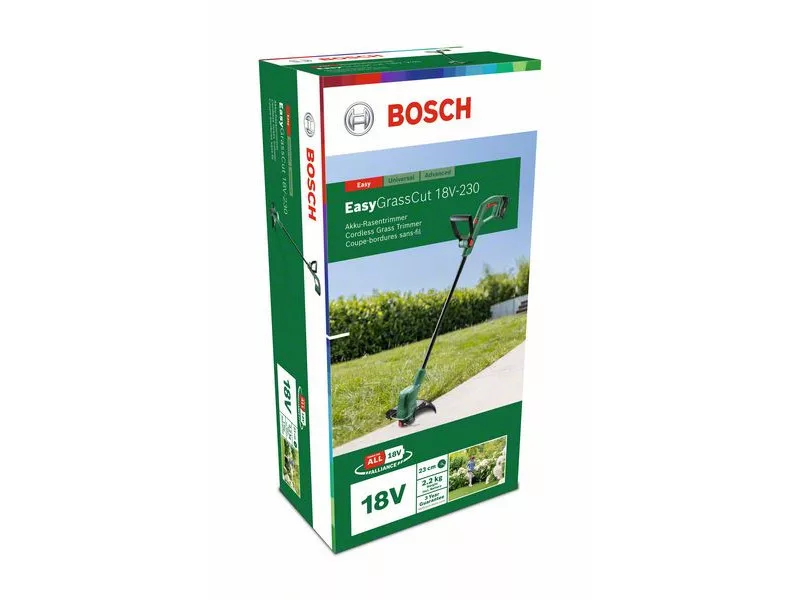 Genießen Sie bequemes und angenehmes Rasenmähen mit dem kabellosen EasyGrassCut 18V-230 Werkzeug. Gleichmäßige Gewichtsverteilung und leicht - einfache Bedienung und kabellose Freiheit für freie Bewegung. Die EdgeSimple Kantenmäherfunktion kann einfach über den oberen Griff aktiviert werden: Mit einem einfachen Knopfdruck und einer Drehung des Werkzeugs können Sie vom Mähen zum Kantenmähen wechseln. Der halbautomatische Fadenspender des Werkzeugs dosiert bei jedem Loslassen des Schalters. Mit einer vollständig aufgeladenen Batterie kann der Trimmer mit einer einzigen Ladung die Kanten von bis zu sechs Tennisplätzen mähen. Dieses Werkzeug ist Teil des POWER FOR ALL ALLIANCE Systems. Mit nur einem Akku können viele Werkzeuge verschiedener Marken betrieben werden-