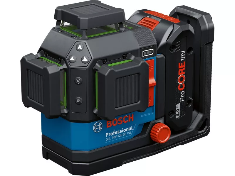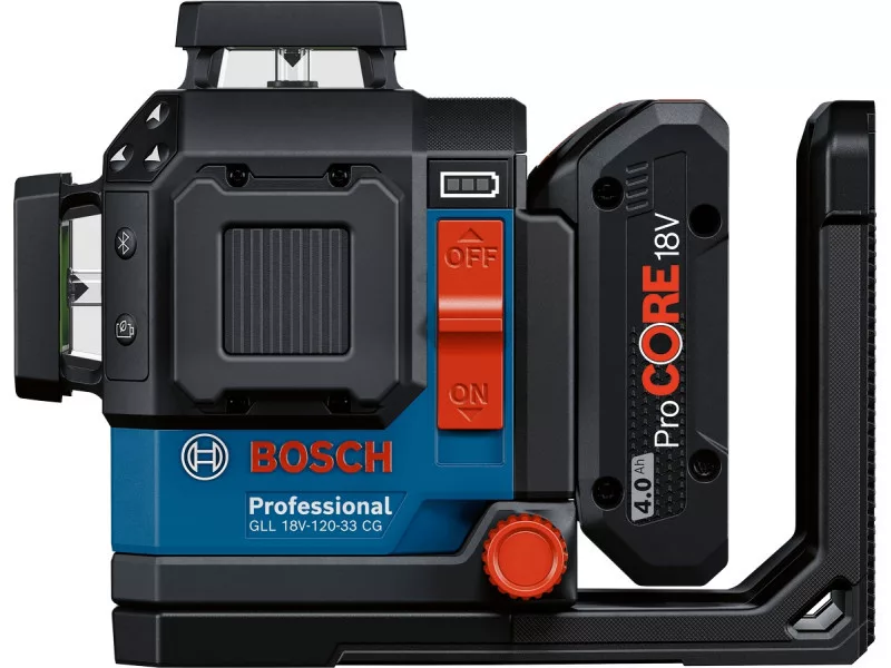 Der GLL 18V-120-33 CG Professional bietet Bauprofis zuverlässige Präzision auch unter härtesten Arbeitsbedingungen. Das Prinzip der drei Stromquellen ermöglicht den Wechsel zwischen 18 V und 12 V Plattformen, und auch alkalische C-Zellen können verwendet werden, um Ausfallzeiten zu vermeiden und sich auf die Aufgabe zu konzentrieren. Dieser robuste Linienlaser verfügt über ein gummibeschichtetes Gehäuse und ist nach IP65 geschützt, sodass Sie sich während der Arbeit keine Sorgen um Wasser, Staub und Stöße machen müssen. Für ein einfacheres Arbeiten verfügt der Laser über eine hintergrundbeleuchtete Tastatur zur individuellen Auswahl der Laserlinien und eine integrierte Basis mit starkem Magneten für eine schnelle und sichere Befestigung. Die vertikale Linie kann mit einer Feineinstellung der Laserlinie ohne Verlust des Referenzpunktes geändert werden.