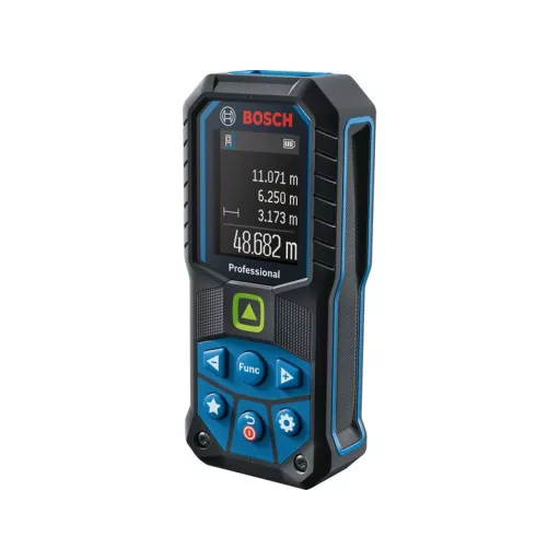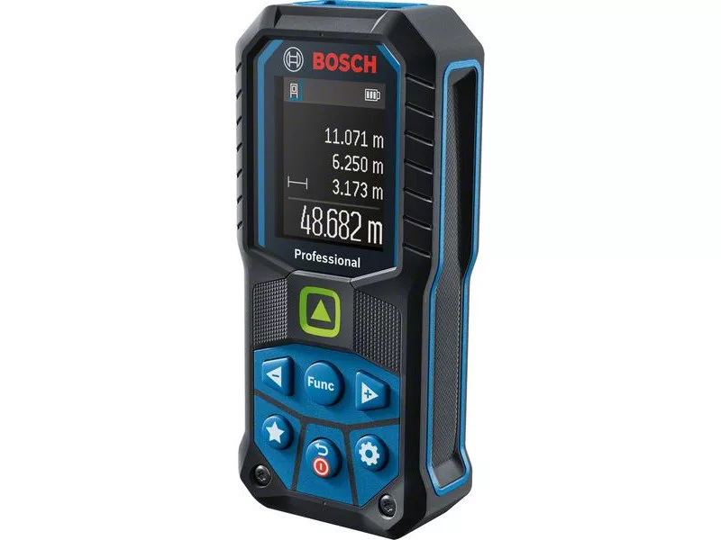 Der GLM 50-25 G Professional bietet einen grünen Laserpunkt mit hervorragender Sichtbarkeit, was das Zielen bei größeren Innenabständen erleichtert. Mit der IP65-Konstruktion ist er vollständig gegen Staub und Wasserstrahlen geschützt, und das stoßdämpfende Gehäuse widersteht sogar dem Fallenlassen aus einer Höhe von 1,5 Metern auf harten Beton. Er verfügt über eine individualisierbare Taste zur Definition häufiger Messfunktionen und Einstellungen und bestätigt Messungen mit einer Vibrationsrückmeldung. Auf seiner intuitiven Benutzeroberfläche können 30 Sprachen ausgewählt werden, und die bessere Lesbarkeit wird durch das farbige Display und den Modus zur Anzeige großer Zahlen sichergestellt.