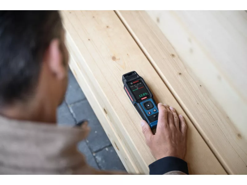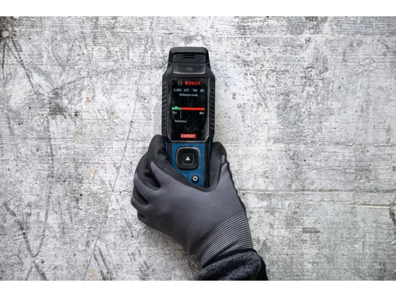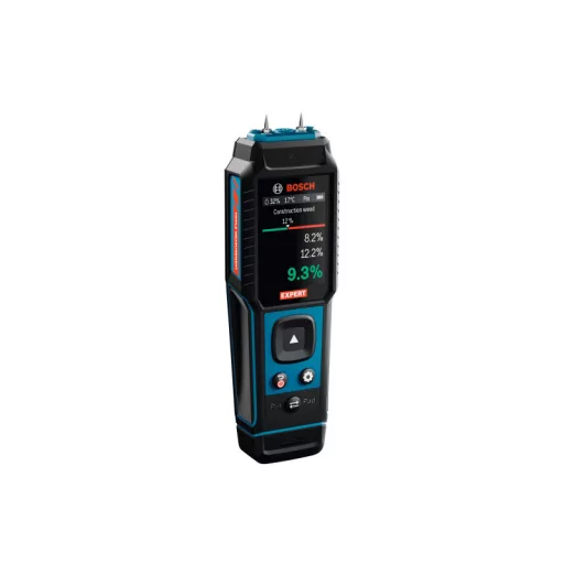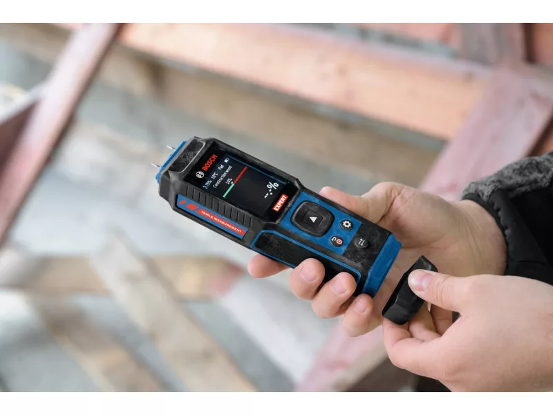 A Bosch legfejlettebb nedvességmérője egy tűérzékelőt (ellenállás mérése) és egy nem invazív párnaérzékelőt (elektromágneses mező mérése) kombinál, valamint egy hő- és páramérőt is tartalmaz a környezeti mérésekhez.