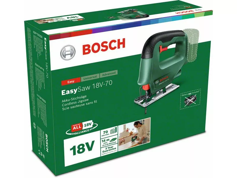 Einfach und zuverlässig, ist die kompakte EasySaw 18V-70 die zuverlässige Wahl für Innen-Heimwerkerarbeiten und kreative Projekte. Diese leichte Stichsäge, die einfach mit nur einem Knopf zu bedienen ist, kann gerade und kurvige Schnitte bis zu einer Tiefe von 70 mm in Holz, z.B. in Holzregalen oder Laminatböden, und bis zu einer Tiefe von 6 mm in Metall vornehmen. Zusätzlichen Komfort bietet der Geschwindigkeitsregler, der einen sanften Start und eine feine Geschwindigkeitseinstellung ermöglicht. Zur Sicherstellung der Schnittgenauigkeit bleibt die Sägelinie dank der speziellen Blasfunktion zur Entfernung von Sägemehl immer klar. Das eingebaute SDS-System garantiert einen einfachen Sägeblattwechsel. Dieses Werkzeug ist Teil des POWER FOR ALL ALLIANCE-Systems. Mit nur einem Akku können eine Vielzahl von Werkzeugen verschiedener Marken betrieben werden.