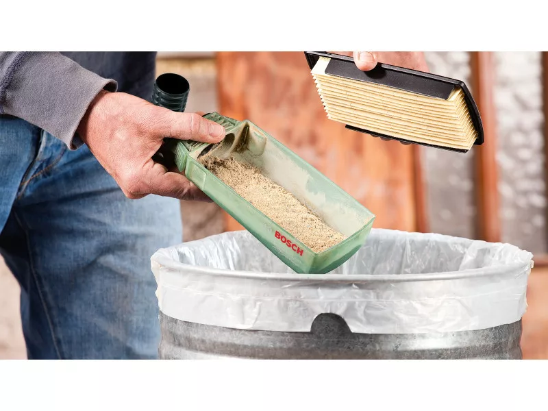 Der mikrogefilterte Staubfangbehälter reduziert Staub für einen saubereren Arbeitsbereich