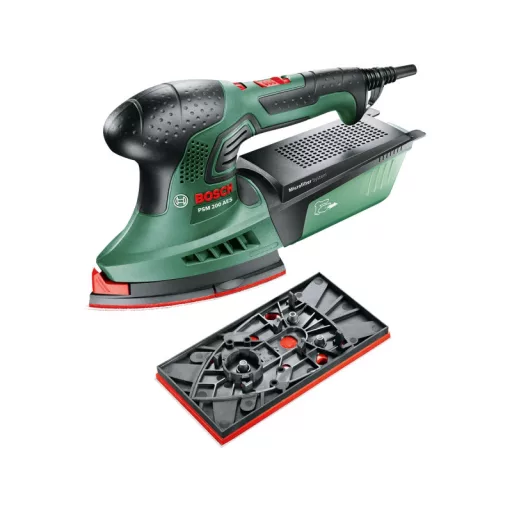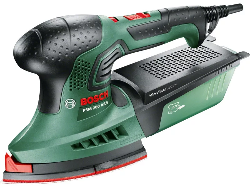 Mit diesem leistungsstarken Universalwerkzeug ist das Schleifen von mittleren und großen Flächen, Ecken und Kanten ein Kinderspiel. Der PSM 200 AES verfügt über eine dreieckige Schleifplatte für Arbeiten an engen Stellen und eine rechteckige Schleifplatte für größere Flächen. Dank des SDS-Systems ist ein schneller Wechsel der Schleifzubehörteile möglich. Dank der elektronischen Drehzahlvorwahl kann die Geschwindigkeit genau auf die jeweilige Aufgabe und das Material abgestimmt werden. Dieser Multischleifer kann auf Holz, lackierten und gestrichenen Flächen, Metall verwendet werden und eignet sich für Arbeiten an Möbeln, Türen und Rahmen, Treppen und Böden. Das Mikrofiltersystem reduziert den Staub.