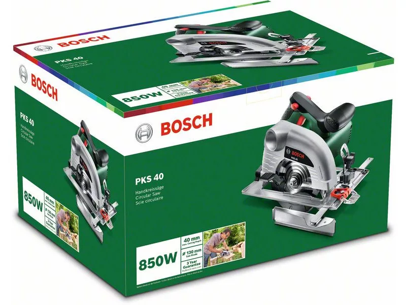 Einfach präzise - Dank des kompakten Designs und des geringen Gewichts (nur 2,6 kg) ist die PKS 40 Kreissäge einfach zu bedienen. CutControl für die Richtungsbestimmung - für genaue Schnitte entlang der gezeichneten Linie. Entworfen für gerade Schnitte in holzbasierten Materialien. Die Sägenachse-Feststellung ermöglicht den Wechsel des Sägeblattes. Die Einstellung der Schnitttiefe und des Schnittwinkels entsprechend den Anforderungen des jeweiligen Schnitts, mit dem eingebauten Feststellhebel.