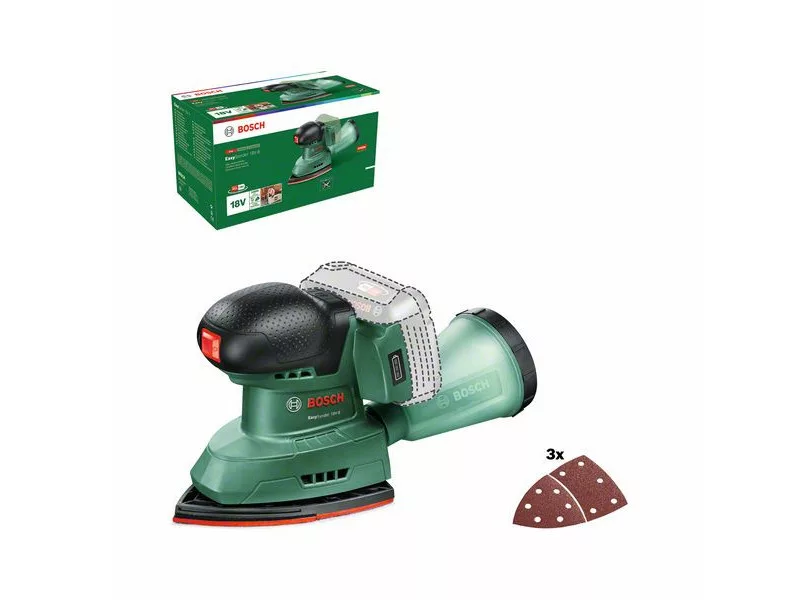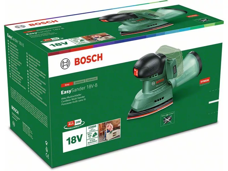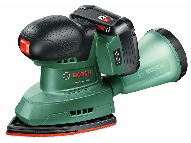 Der leistungsstarke, akkubetriebene EasySander 18V-8 ist perfekt für eine Vielzahl von Projekten. Multifunktional, entworfen für uneingeschränkte Arbeit an Ecken, Kanten und mittleren ebenen Flächen. Schneller und einfacher Wechsel des Schleifpapiers dank Klettverschlusssystem. Dieses Werkzeug ist perfekt für Hartholz, Weichholz, lackierte und bemalte Oberflächen, Möbel, Türen usw. Der leicht zu entnehmende Mikrofilter-Staubbehälter reduziert die Staubmenge und sorgt so für einen sauberen Arbeitsbereich. Die eingebaute Bosch Syneon Technologie sorgt für optimale Leistung bei maximaler Laufzeit. Dieses Werkzeug ist Teil des 18V POWER FOR ALL ALLIANCE Systems. Ein Akku für alle 18V POWER FOR ALL Werkzeuge.
