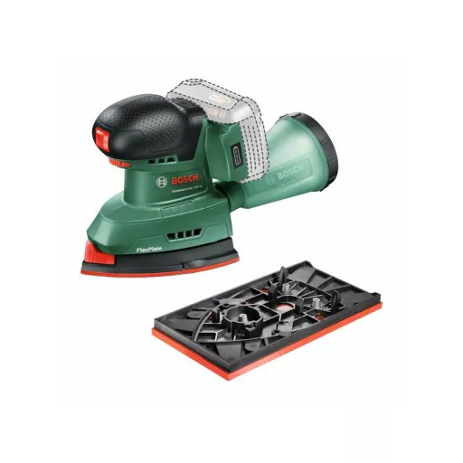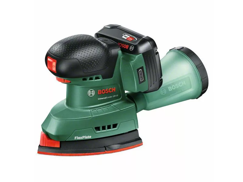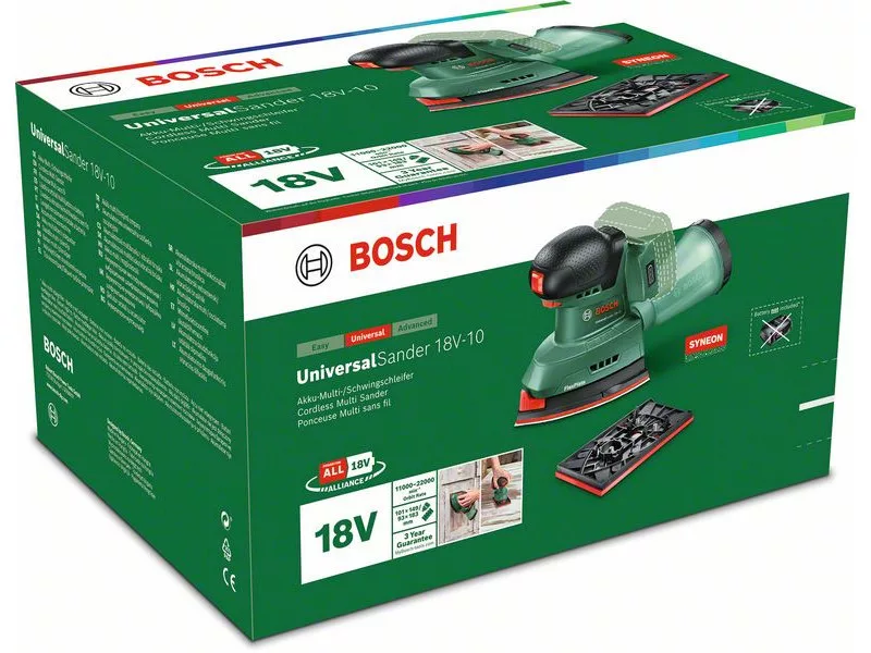 Der akkubetriebene UniversalSander 18V-10 hat eine Bügeleisenförmige Sohle für das Schleifen an engen Stellen, Ecken und Kanten, während die rechteckige Sohle für mittlere und große, flache Oberflächen geeignet ist. Mit der elektronischen Drehzahlvorwahl kann die ideale Einstellung für jede Aufgabe und jedes Material gewählt werden. Das Zubehör kann schnell mit dem SDS-System gewechselt werden. Dieser Schleifer eignet sich ideal für das Schleifen von Holz, lackierten und bemalten Oberflächen, wie zum Beispiel Möbel, Türen, Rahmen usw. Die leicht abnehmbare Mikrofilter-Staubfangbox reduziert den Staub und sorgt so für einen sauberen Arbeitsbereich. Die integrierte Bosch Syneon-Technologie sorgt für eine optimale Leistung bei maximaler Laufzeit. Dieses Werkzeug ist Teil des 18V POWER FOR ALL ALLIANCE Systems. Ein Akku für alle 18V POWER FOR ALL Werkzeuge.