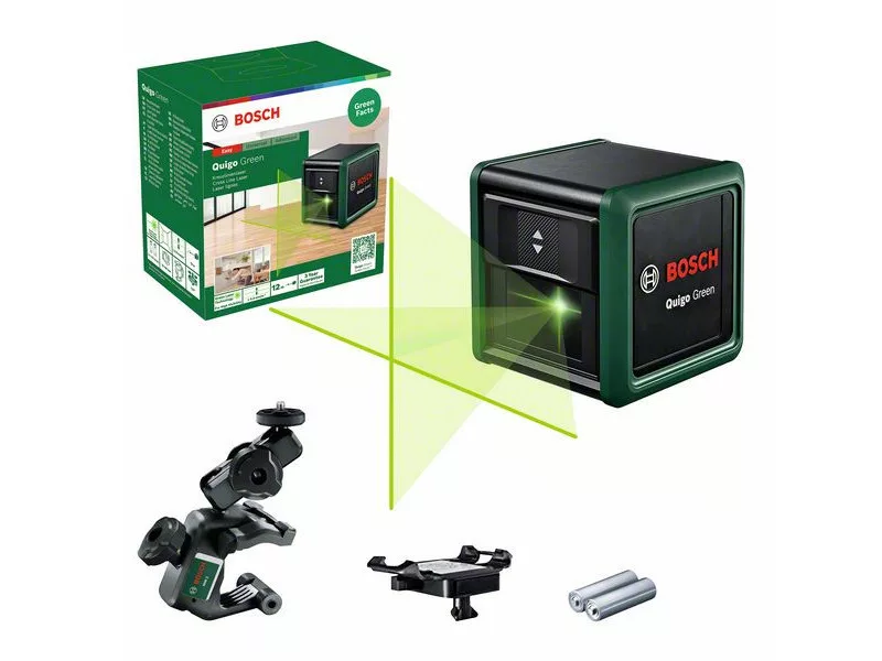 Werden Sie ganz grün mit dem Quigo Green Kreuzlinienlaser der neuen Generation von Bosch, der hervorragende Sichtbarkeit und einfache Bedienung für Heimwerkerprojekte bietet. Mit seinen lebendigen grünen Kreuzlaserlinien ist der Quigo Green eine perfekte Einstellungslösung für Arbeiten bei sehr hellen Lichtverhältnissen. Er hat eine erhöhte Genauigkeit von +/- 0,6 mm/m und eine maximale Reichweite von 12 m. Für noch mehr Komfort enthält dieser vielseitige Kreuzlinienlaser eine MM 2 Universal-Klemme und eine Adapterplatte für eine einfache Befestigung. Der Quigo Green nivelliert sich selbst innerhalb eines Bereichs von +/-4°, um die gerade Ausrichtung von Spiegeln, Regalen oder Fliesen zu gewährleisten.