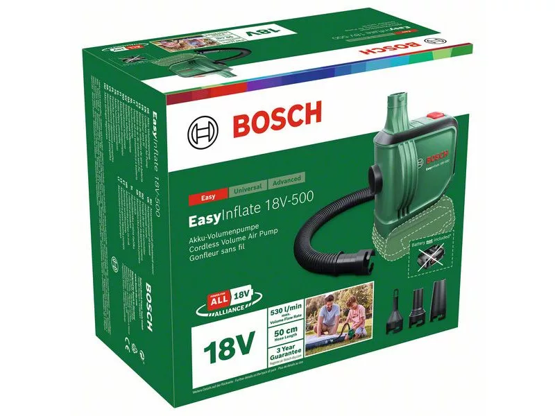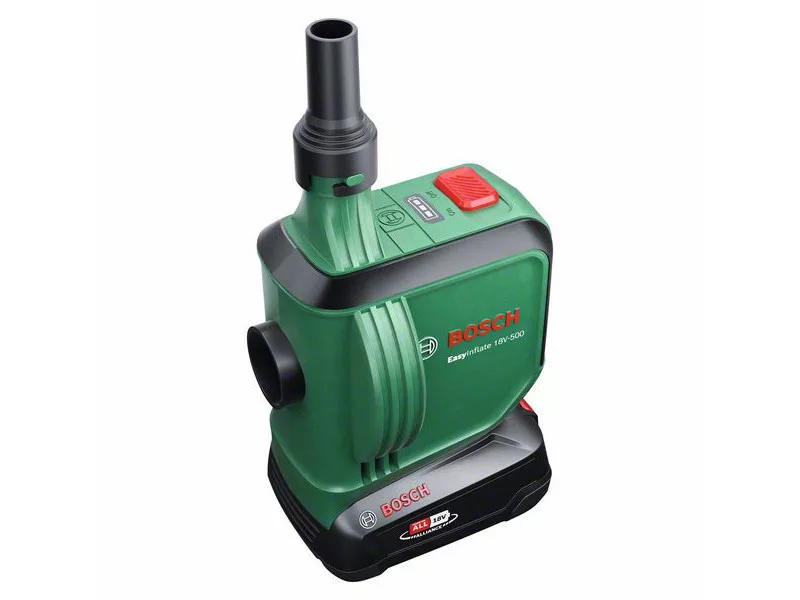 A Bosch EasyInflate 18V-500 akkus légpumpa 530 l/min maximális térfogatáramával a vízi játékok, felfújható csónakok, gumimatracok és más nagy térfogatú tárgyak felfújásának és leeresztésének sebességét új szintre emeli. Az 50 cm hosszú tömlő és az egyszerű be/ki kapcsoló kényelmes működtetést biztosít. A kompakt pumpához háromféle adapter van mellékelve a különböző méretű szelepekhez, és egy táska, amelyben minden egyszerűen elvihető a medencéhez, a tóhoz vagy a kempingezéshez. Ez a nagy térfogatokhoz alkalmas pumpa a 18V POWER FOR ALL ALLIANCE rendszer része. Egyetlen akkumulátor minden 18V POWER FOR ALL szerszámhoz.