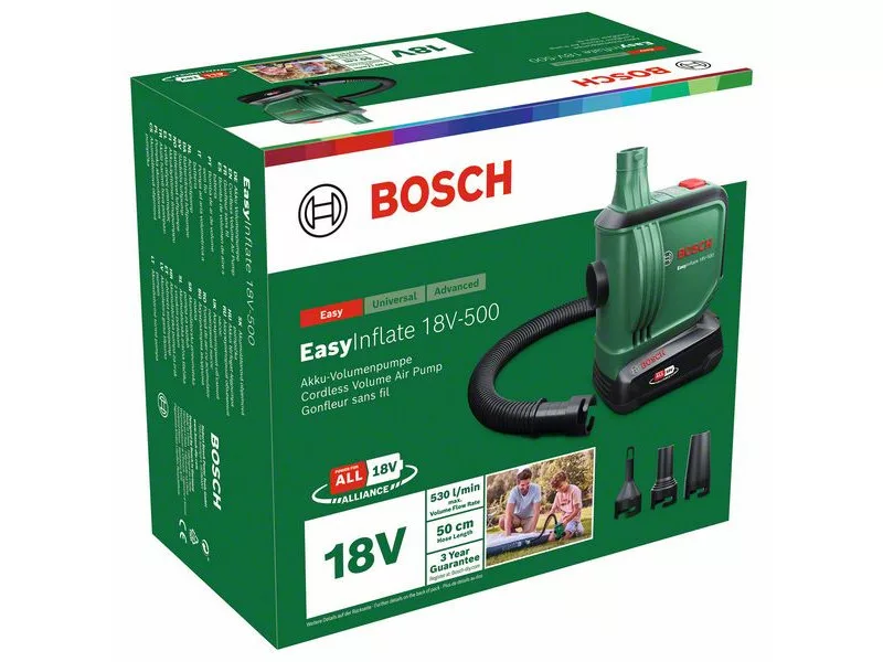 Die Bosch EasyInflate 18V-500 Akku-Luftpumpe erhöht mit ihrem maximalen Volumenstrom von 530 l/min die Geschwindigkeit des Aufpumpens und Entlüftens von Wasserspielzeug, Schlauchbooten, Luftmatratzen und anderen Gegenständen mit hohem Volumen auf ein neues Niveau. Der 50 cm lange Schlauch und der einfache Ein-/Ausschalter gewährleisten eine komfortable Bedienung. Die kompakte Pumpe wird mit drei verschiedenen Adaptern für verschiedene Ventilgrößen und einer Tasche geliefert, in der alles einfach zum Pool, zum See oder zum Campingplatz transportiert werden kann. Diese Pumpe für hohe Volumen ist Teil des 18V POWER FOR ALL ALLIANCE Systems. Ein Akku für alle 18V POWER FOR ALL Werkzeuge.