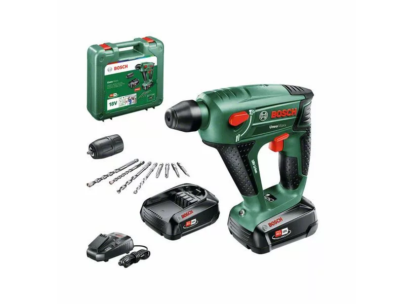 Der kraftvolle und kompakte 3-in-1-Uneo Maxx Akku-Bohrhammer wurde für die härtesten Hammerbohr-, Bohr- und Schraubarbeiten in Beton, Mauerwerk, Metall, Holz und Fliesen konzipiert. Der pneumatische Schlagmechanismus von Bosch und der starke Motor ermöglichen einfaches und schnelles Bohren in Beton, bis zu einer Tiefe von 10 mm. Es verfügt über ein SDS-System-Bohrfutter für die benutzerfreundliche Verwendung von 1/4"-Sechskant- und SDS-Quick-Bits, sowie für einen schnellen Austausch in nur 3 Sekunden. Dieser ausgesprochen leichte (1,4 kg) und kompakte Kraftprotz ist auch in engen Räumen komfortabel zu bedienen und erledigt mühelos verschiedene Aufgaben – ob Bohren in Beton oder präzises Schrauben in Holz. Dieses Werkzeug ist Teil des POWER FOR ALL ALLIANCE Systems. Mit nur einem Akku können eine Vielzahl von Werkzeugen verschiedener Marken betrieben werden.