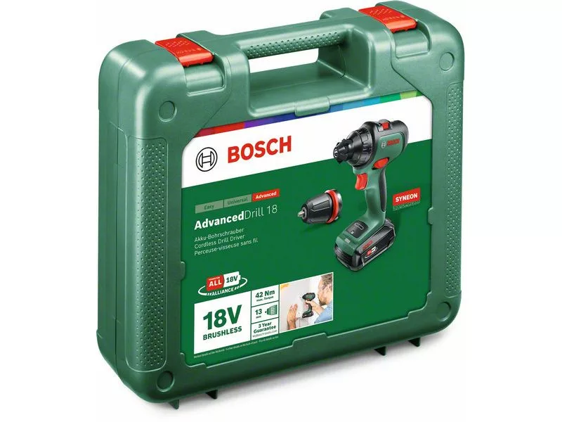 Äußerst benutzerfreundlicher und flexibler Akku-Bohrschrauber. Die Auswahl des gewünschten Modus ermöglicht eine einfache und automatische Einstellung des richtigen Gangs für Schraub- und Bohrarbeiten. Die Drehrichtung kann mit einem Klick über das innovative elektronische Schaltersystem mit LED-Anzeige geändert werden. Der bürstenlose Motor bietet eine kraftvolle, kompakte und langlebige Lösung. Magnetischer Bit für das Schrauben und 13 mm Bohrfutter für das Bohren - so wird der Wechsel zwischen den Aufgaben noch einfacher. Mit dem AdvancedDrill 18 können vielfältige Aufgaben in Holz, Kunststoff und Metall ausgeführt werden. Dieses Werkzeug ist Teil des POWER FOR ALL ALLIANCE Systems. Mit einem einzigen Akku können eine Vielzahl von Werkzeugen verschiedener Marken betrieben werden.