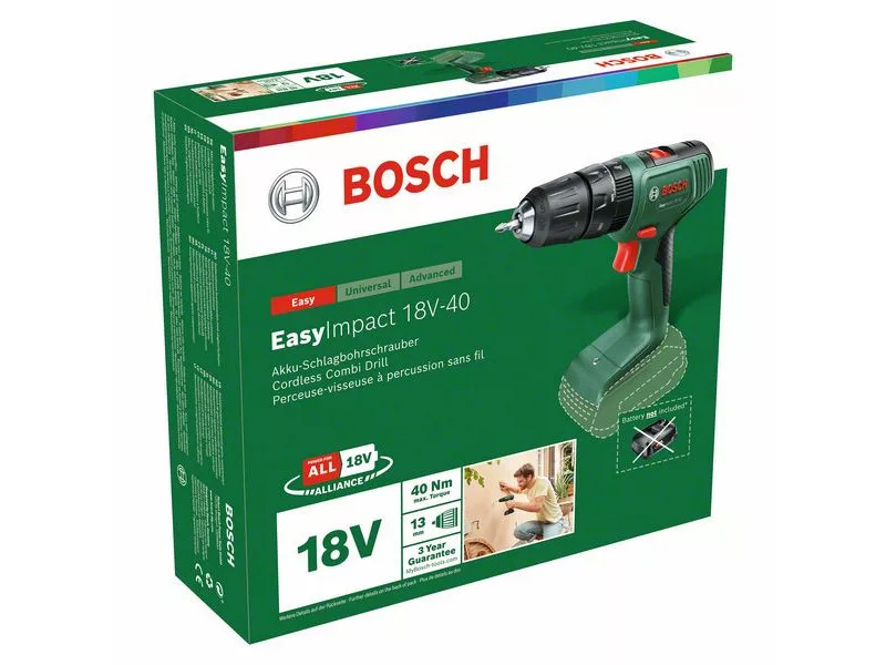 A kompakt EasyImpact 18V-40 sokoldalú szerszám csavarbehajtáshoz, fúráshoz és ütvefúráshoz. A kényelmes munkavégzéshez tervezett keskeny, ergonomikus fúró LED-világítással, 13 mm-es egyhüvelyes tokmánnyal, két fokozattal és 20 nyomatékszinttel rendelkezik a fémben, fában, műanyagban és falazatban történő egyszerű használathoz..