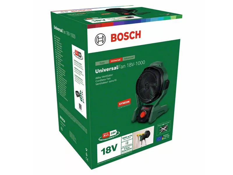 Der brandneue, kabellose Bosch UniversalFan 18V-1000 wurde speziell für die speziellen Anforderungen von Heimwerkern entwickelt. Er ist leicht, kompakt und robust, während die innovative Bosch JetBreeze Airflow Technologie einen kraftvollen, konzentrierten Luftstrom erzeugt, mit exzellenter Laufzeit und angenehm leisem Betrieb. Die Ventilatorgeschwindigkeit kann stufenlos eingestellt werden und die Funktion "Konstante Leistung" hält die Leistung während der gesamten Akkulaufzeit konstant. Genießen Sie maximale Vielseitigkeit: Dank der verschiedenen Aufhänge- und Befestigungsmöglichkeiten, einschließlich Haken, Schlüssellochhalterung und Dreibeinstativ, kann der Ventilator fast überall verwendet werden. Die Luftstromrichtung kann durch Neigen des Ventilatorkopfes um 180° gesteuert werden, sodass der Luftstrom genau dorthin gelenkt werden kann, wo er benötigt wird. Effizient konzipiert: Der UniversalFan 18V-1000 wird in der EU hergestellt und besteht zu 90% aus recycelten Materialien. Die integrierte Bosch Syneon Elektronik schützt das Werkzeug und den Akku. Dieses Werkzeug ist Teil des POWER FOR ALL ALLIANCE Systems. Mit einer einzigen Batterie können zahlreiche Werkzeuge verschiedener Marken betrieben werden.