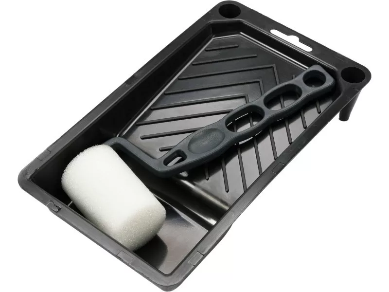 Lightweight painting roller with a length of 5 cm in a set with a plastic cuvette for conveniently scooping paint and squeezing out excess paint.