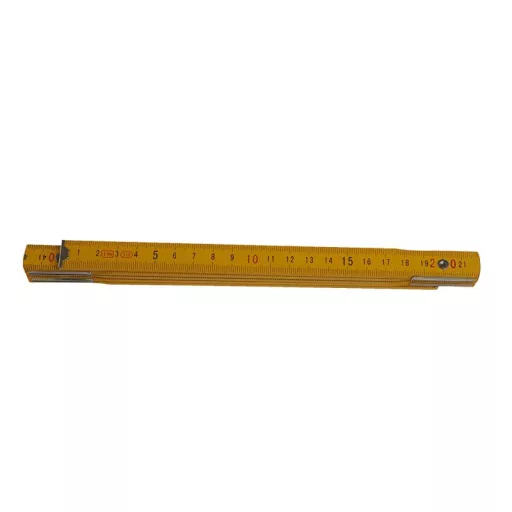 Összecsukható fa mérőszalag, 90°-os állású zárak, kétoldalas skála mm-ben, sárga színben.
