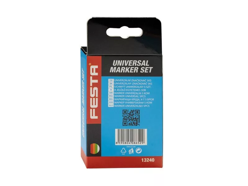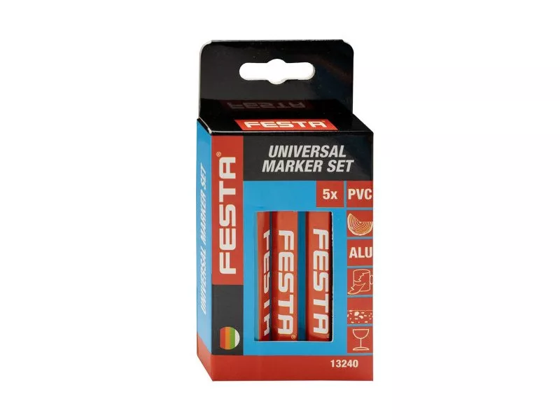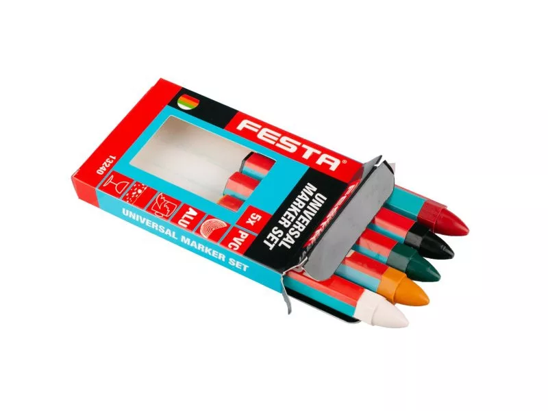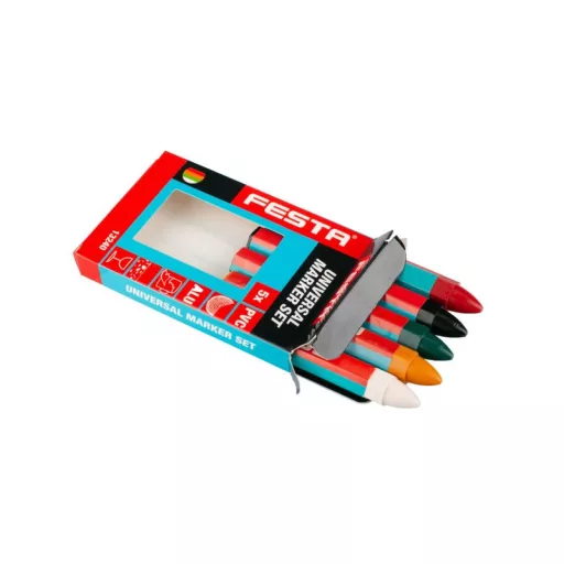 Pastell-Marker-Set, Länge 120 mm, in 5 Farben (rot, schwarz, gelb, grün, weiß) verpackt. Geeignet für: Mauerwerk, Metall, Holz, Glas, Kunststoff, Keramik.
