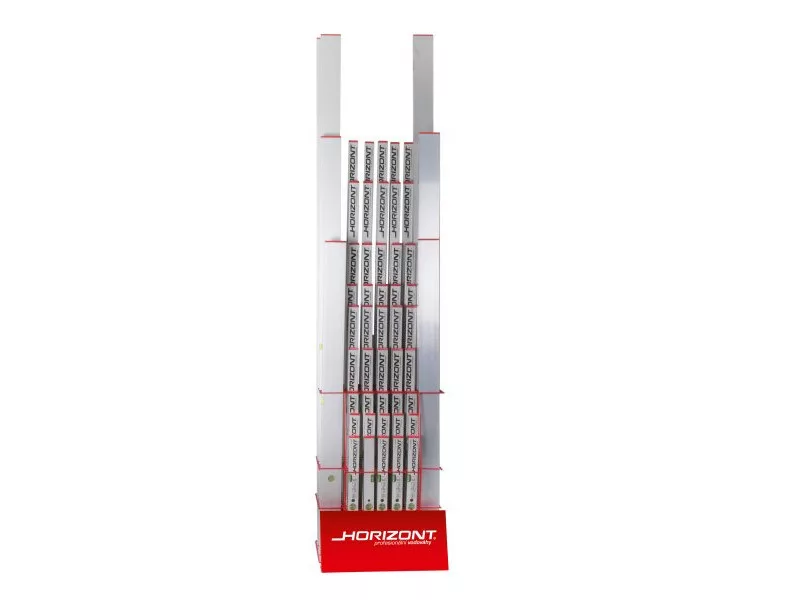 Professzionális HORIZONT vízmértékek bemutatására szolgáló állvány. A statisztikák szerint a standon való bemutatás 30%-kal növeli a vízmértékek eladását. A kép illusztráció, az állvány vízmérték nélküli.