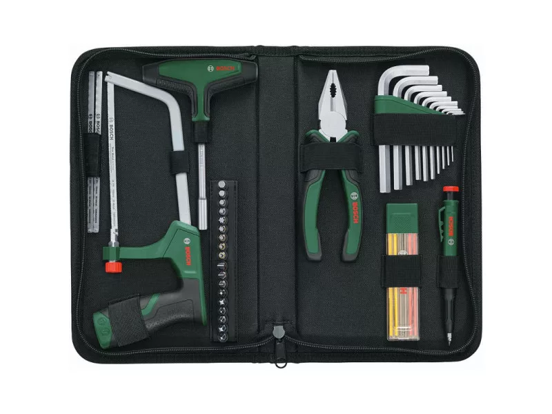 Inhalt: 150 mm Metallsäge, T-Griff-Bitschraubendreher, 180 mm Kombizange, Tieflochmarkierungsstift, 10-teiliges Inbusschlüssel-Set, 18 farbcodierte Bits, 2 Metallsägeblätter und 6 farbige Einsätze