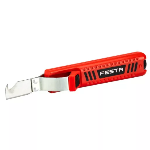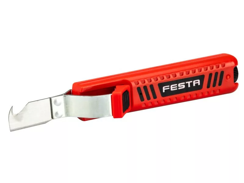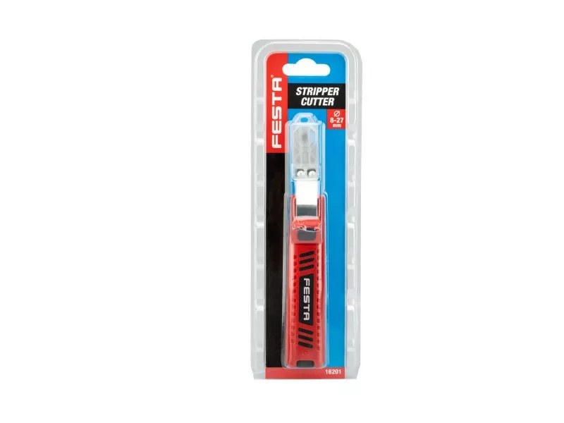 Speciális kés vezetékek csupaszításához, forgókés 8-27 mm átmérőjű kábelek kör- és hosszirányú vágásához, állítható kábeltartó automatikusan alkalmazkodik az adott kábelhez, a hüvelyt a kést körbeforgatva és a kést végighúzva vágjuk a kábel hossza, buborékfólia.