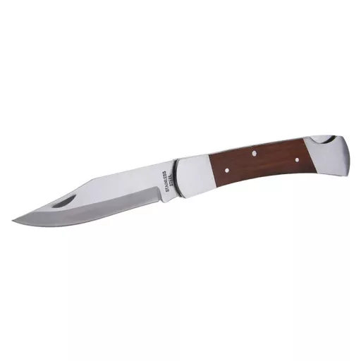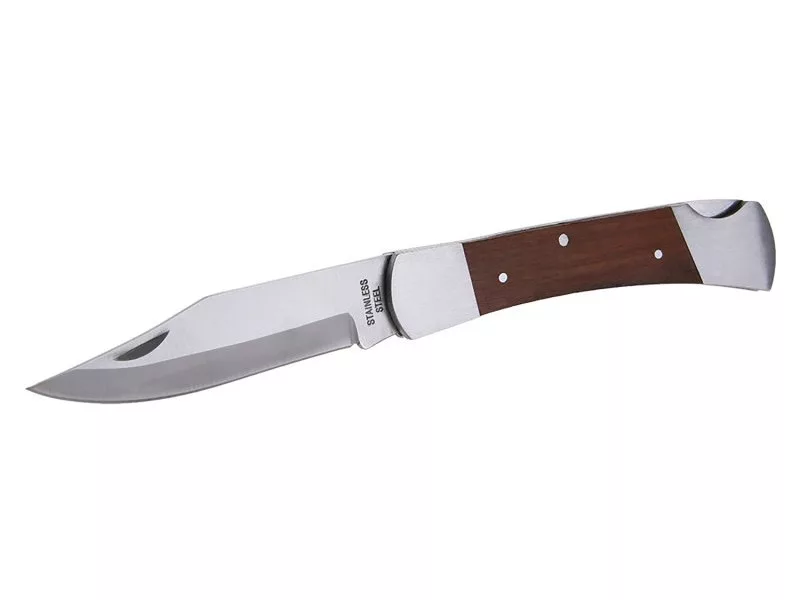 Klappbares Taschenmesser mit Verriegelung gegen versehentliches Schließen der Klinge, rostfreie Klinge, Holzgriff, hochwertige Nietarbeit, Klingenlänge 120 mm, Luftpolsterfolie.