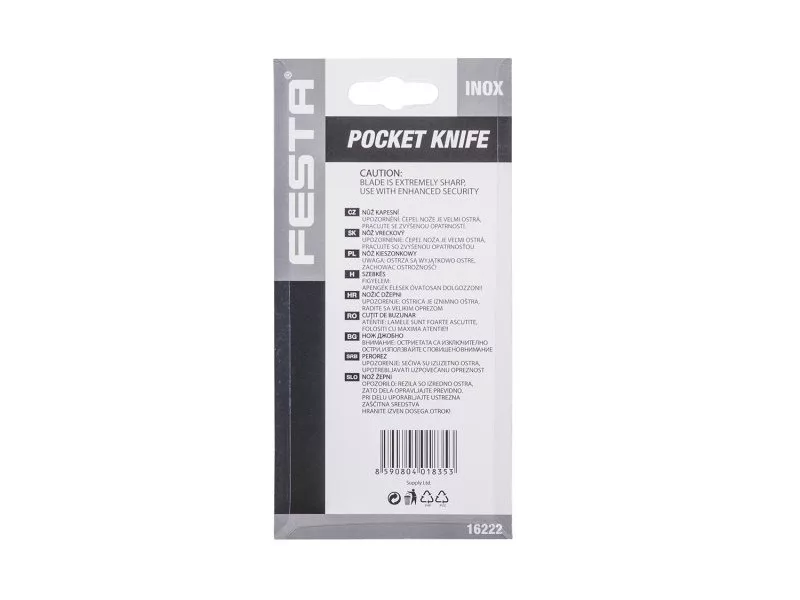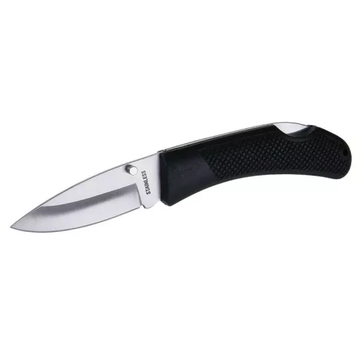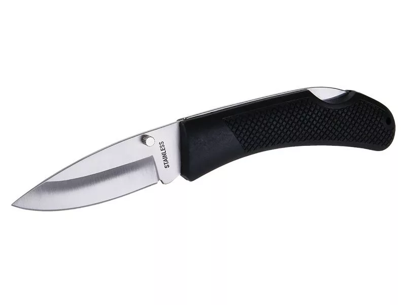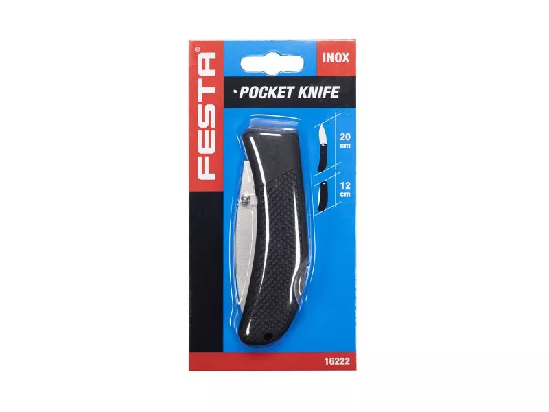 Összecsukható zsebkés biztonsági berendezéssel a penge véletlen bezáródása ellen, műanyag fogantyú, egykezes nyitás, rozsdamentes penge, kiváló minőségű szegecselés, pengehossz 120 mm, buborékfólia.