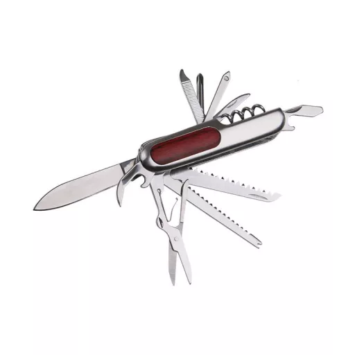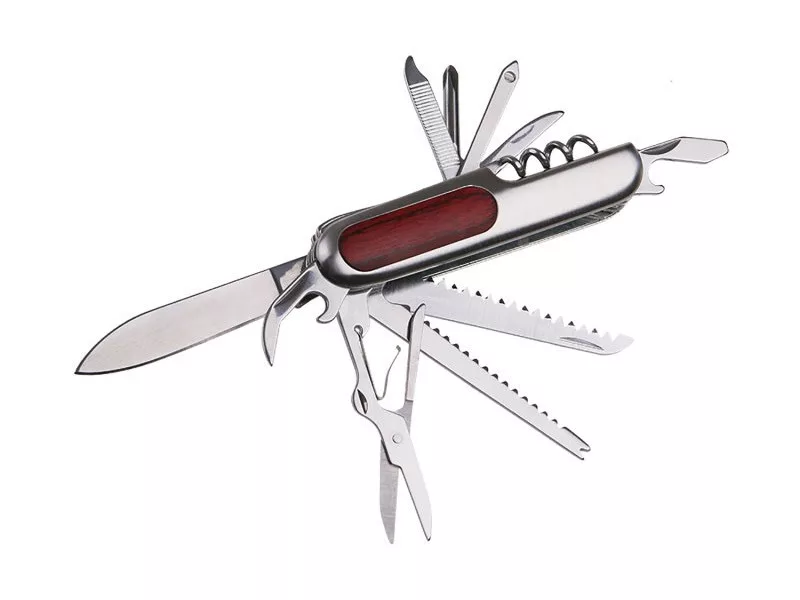 INOX multifunkcionális zsebkés. Zárt kés hossza 95 mm. Rozsdamentes acél multifunkcionális kés 11 különböző résszel, különböző felhasználási célokra. A fogantyú fém és fa kombinációja. Súlya 0,666 kg.