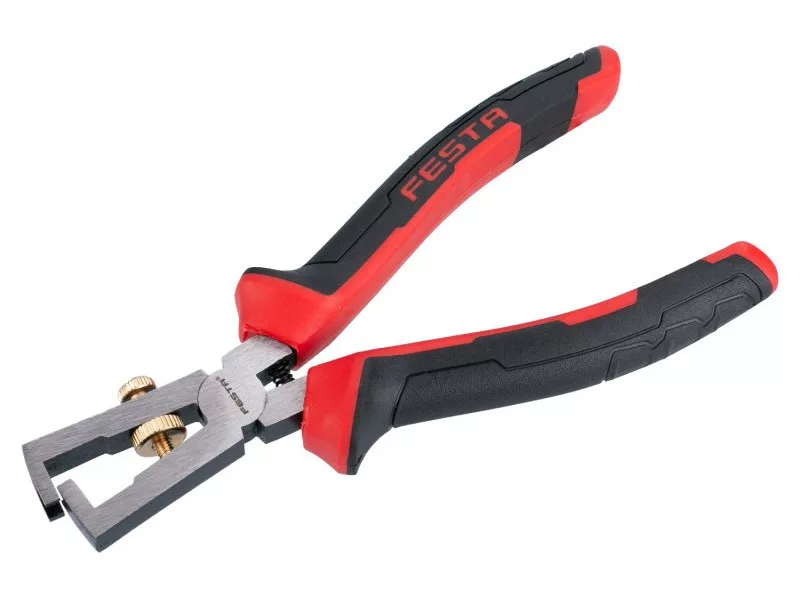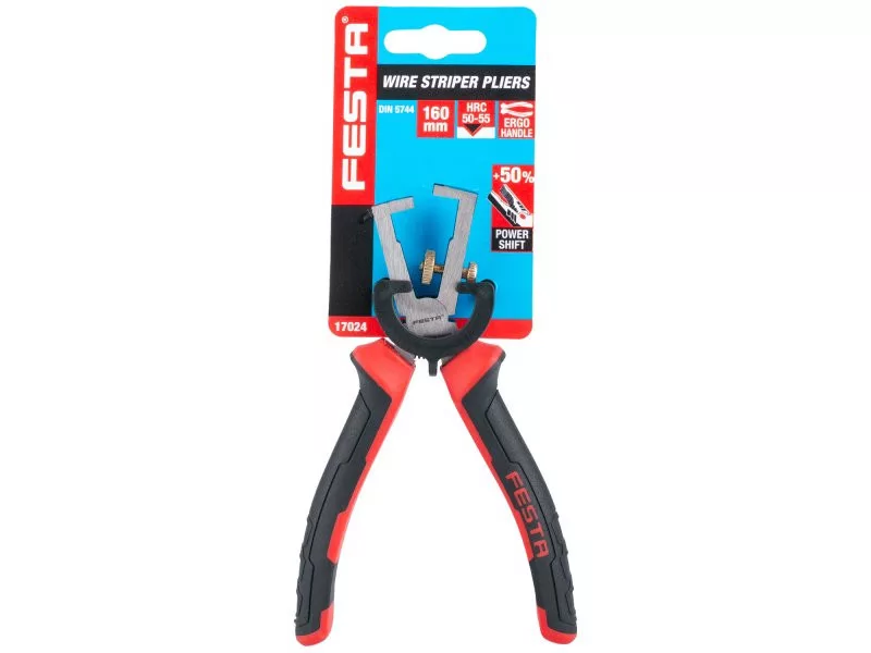 FESTA 160 mm-es csupaszító fogó, állítható pofák a könnyű huzalcsupaszításhoz, ergonomikus fogantyúk, tanúsítvánnyal 1000 V-ig, gyártó ISO 9001 tanúsítvánnyal, buborékfólia.