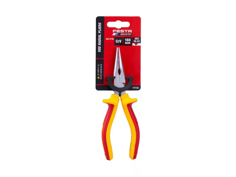 Die 160 mm FESTA VDE Radiopinzetten sind mit einem Elektro VDE 1000 V, IEC/EN 60900-2004 Zertifikat ausgestattet. Der ergonomisch gestaltete Griff kombiniert Polypropylen und Gummi für hervorragende Rutschfestigkeit und Beständigkeit gegen gute Schmierstoffe und Chemikalien. Die Greifbacken sind aus besonders verschleißfestem Chrom-Vanadium Hochleistungsstahl gefertigt. Das Gewicht beträgt 0,233 kg.