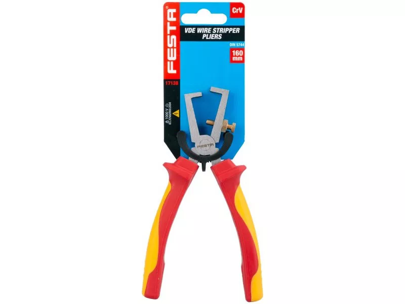 Der VDE 160 mm FESTA Kneifzange Elektro VDE 1000 V, ist mit dem IEC/EN 60900-2004 Zertifikat ausgestattet. Die Kombination aus Polypropylen und Gummi auf den ergonomisch gestalteten Griffen gewährleistet hervorragende Rutschfestigkeit und gute Beständigkeit gegen Schmierstoffe und Chemikalien. Die Backen bestehen aus besonders verschleißfestem Chrom-Vanadium Hochleistungsstahl. Das Gewicht beträgt 0,283 kg.