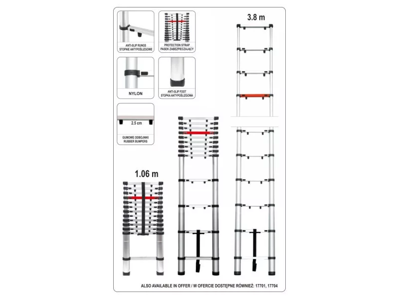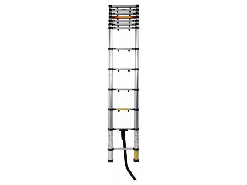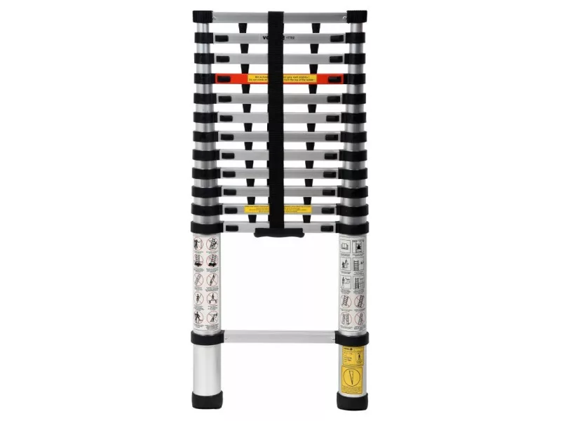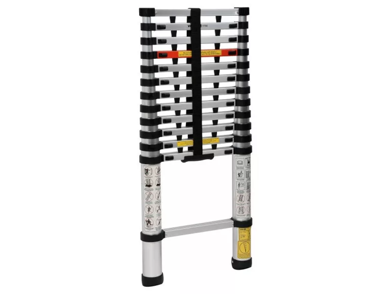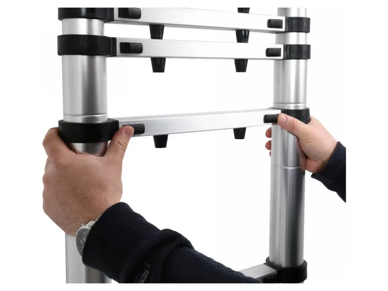 Aluminum telescopic ladder useful for work at heights performed at home, garden, warehouse, workshop and construction site.