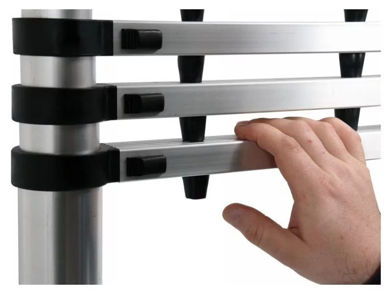 Always fully extend from the bottom! Make sure that each step was locked, there is no possibility to release it. Shift both locks at the same time and let the ladder release automatically.