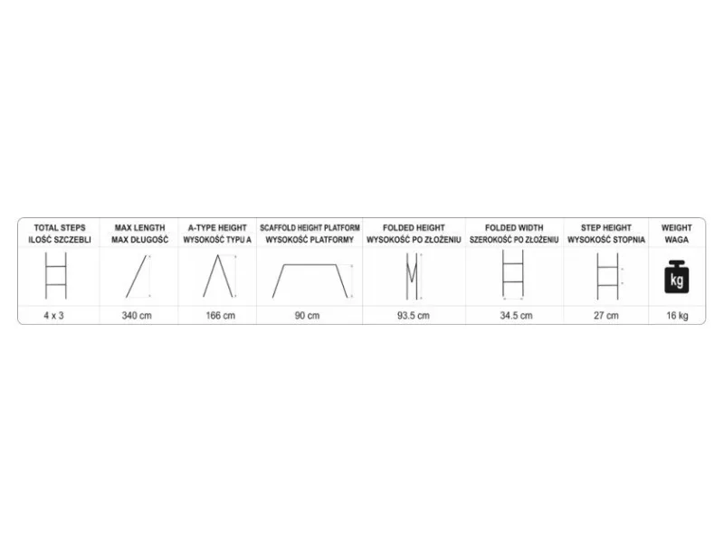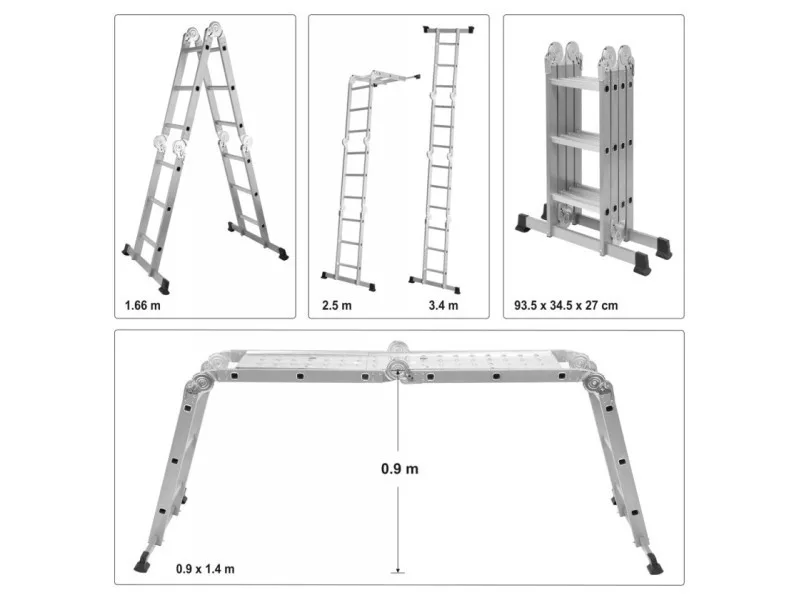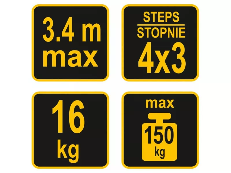 Multifunctional ladder 4x3 with a maximum height of 3,4m. Meets the requirements European standard PN EN131 with a load capacity per step of 150kg. It consists of four segments connected by strong and durable joints.