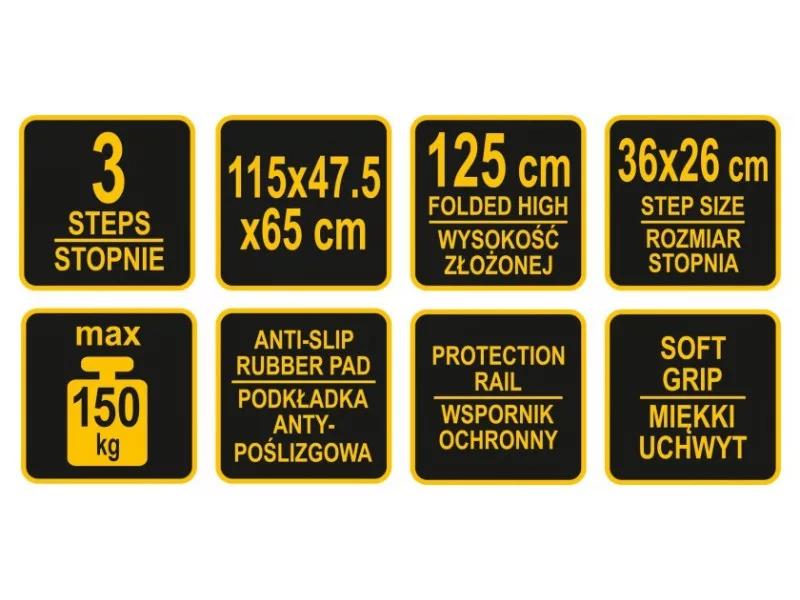 The ladder has 3 steps with dimensions 36x26cm, which&oac;re additionally equipped with anti-slip pads.This allows you to confidently and stably stand on it without fear of slipping or tripping. An additional protective support at the góry of the ladder with soft sponge padding protects against falling, and at the same time is very convenient to carry.
