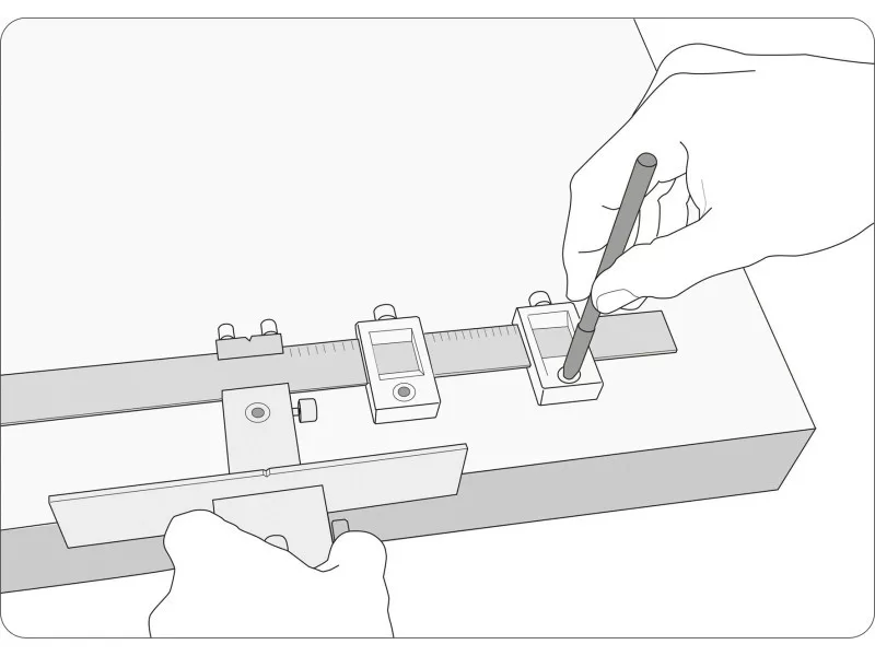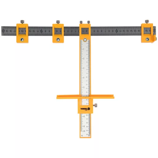 Template for determining drilling points. Horizontal frame is made of steel sheet with permanently applied with a millimeter and inch scale, length 200 +200 mm. Three movable, mounted markers can be blocked on the strip. A 250 mm vertical strip and a parallel limiter were made of ABS plastic, a strip equipped with a metal insert with a millimeter and inch scale. The device is packed in a protective, textile cover. The device is intended for precise designation of drilling points, it gives the possibility of quick transfer of points without having to re -dimension.