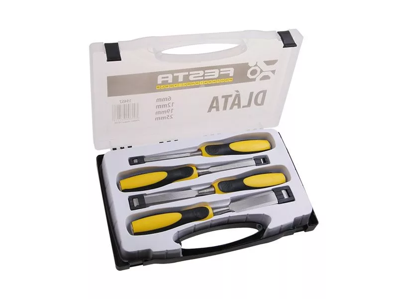 FESTA vésőkészlet 4 db 6, 12, 19, 25 mm, ergonomikus műanyag nyéllel, ütőfelülettel. A penge teljes hosszában edzett CrV acélból van kovácsolva.