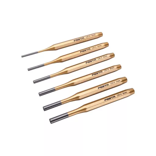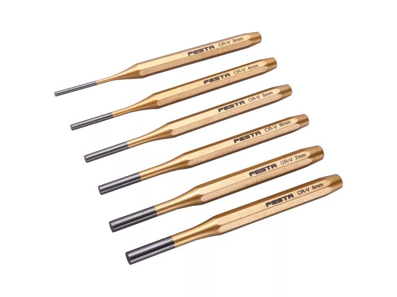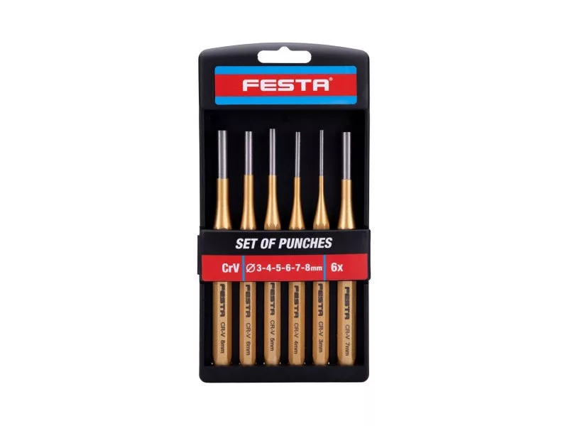 TiN FESTA lyukasztókészlet króm-vanádium acélból. A készlet 6 db-ot tartalmaz: 3, 4, 5, 6, 7, 8 mm.