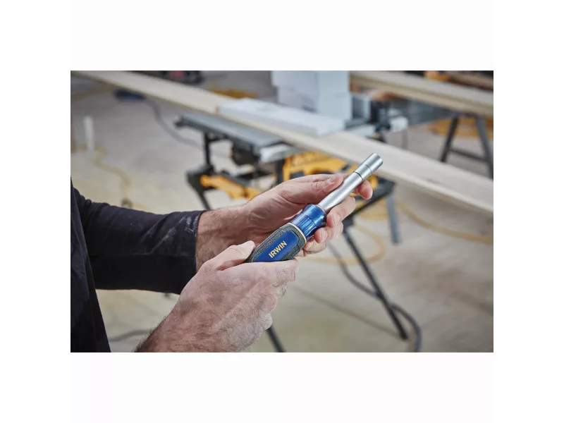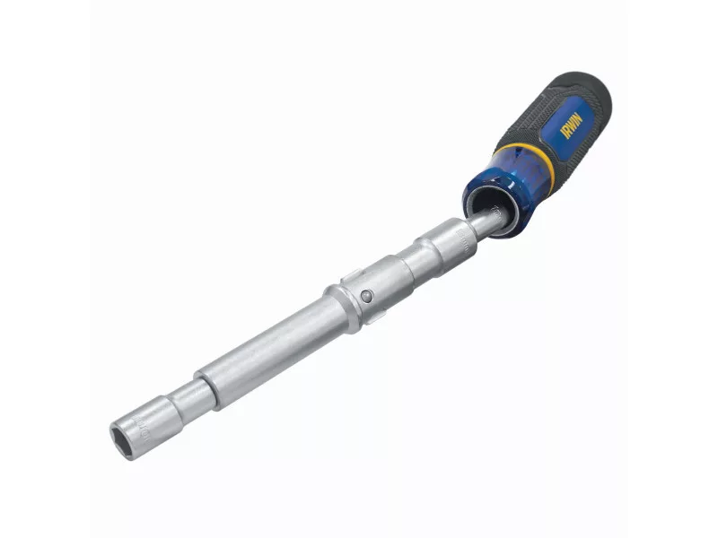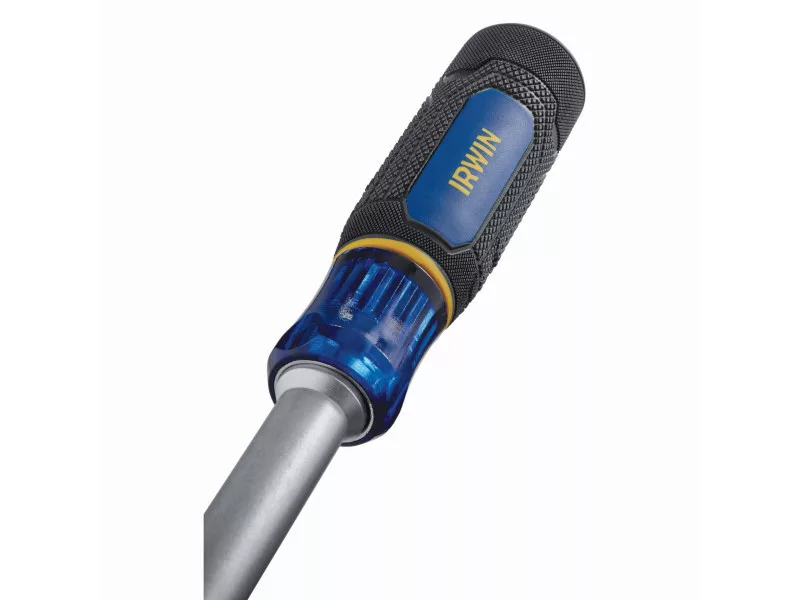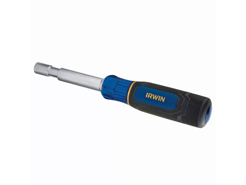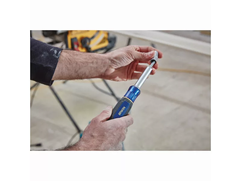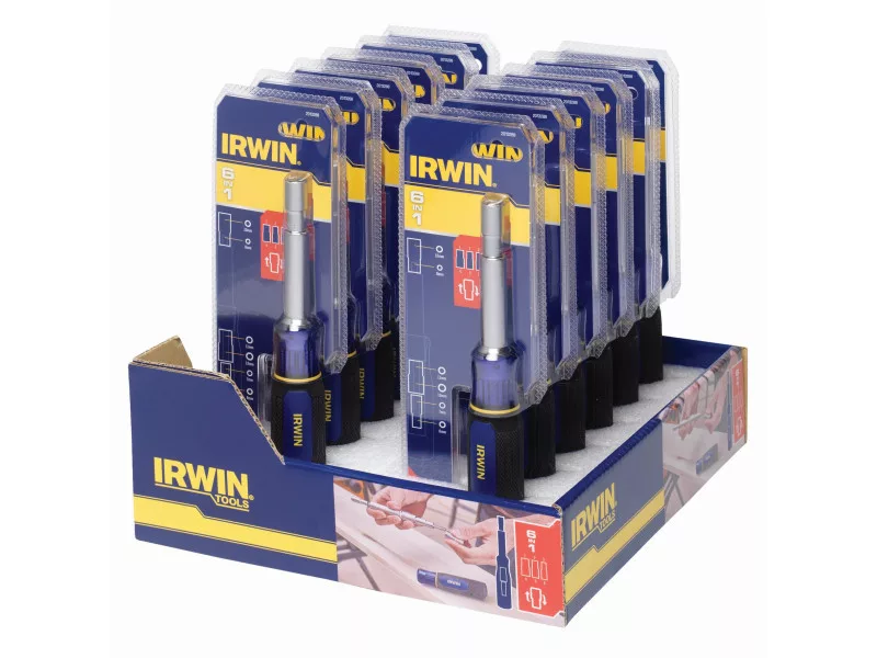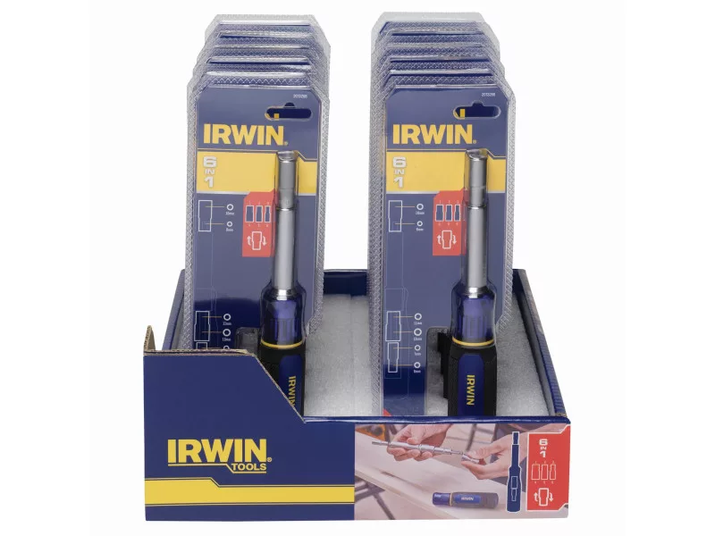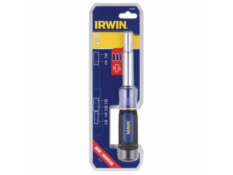 Az IRWIN® 6 az 1-ben csavarhúzó bithegy tartó növeli a munka kényelmét azáltal, hogy 6 méretet kombinál az anyák és csavarok egyetlen szerszámmal történő rögzítéséhez.