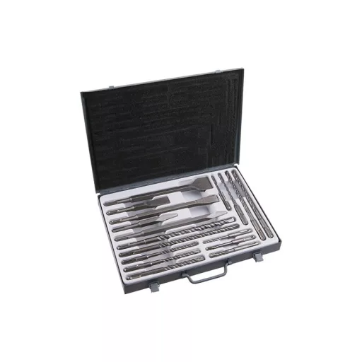 Vésők és fúrók SDS + - 17 darabos készlet, kiváló minőségű kombinált véső- és fúrókészlet SDS-ben való rögzítéssel + elektromos fúrókalapács (kombinálható a 20744-es adapterrel SDS MAX rögzítéssel rendelkező gépeknél), összetétel: 5, 6, 8 x 110mm - 6, 8, 10, 12 x 160 mm - 8, 10 x 210 - 12, 14 x 260 mm, felhasználás: vésők - bontáshoz, betonvágáshoz, falazáshoz, burkoláshoz..., fúrók - ütvefúrás betonban, falazatban, csempében, kőedényben..., csomagolás: tartós bádogdoboz.