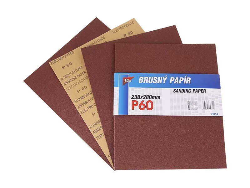 Csiszolópapír - 10 db-os készlet, szemcseméret: 60, szemcse típusa: alumínium-oxid, kötőanyag: műgyanta, hátlap anyaga: rugalmas papír C (110-135g/m2), méretek: a termék megnevezésében feltüntetve, csomagolás: 10 db - papír hüvely.