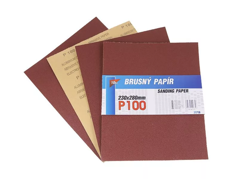 Csiszolópapír - 10 darabos készlet, szemcse: 100 szemcse, kötőanyag: műgyanta, hátlap anyaga: rugalmas papír C (110-135g/m2), méretek: a termék megnevezésében feltüntetve, csomagolás: 10 db - papír hüvely.