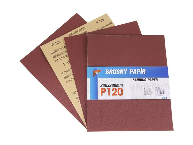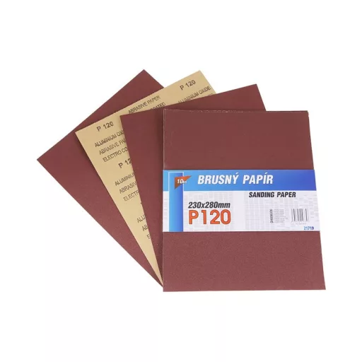 Csiszolópapír - 10 db-os készlet, szemcse: 120, szemcse típusa: alumínium-oxid, kötőanyag: műgyanta, alapanyag: rugalmas papír C (110-135g/m2), méretek: a termék megnevezésében feltüntetve, kiszerelés: 10 db - papír hüvely.