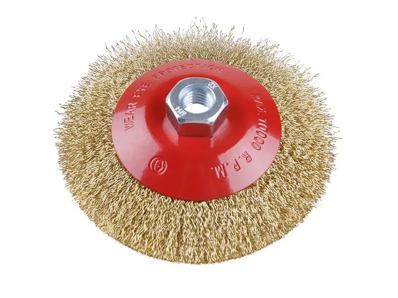 Forgókefe - csésze, FESTA kefe minőségi felhasznált anyagokat és feldolgozást garantál, hullámos huzal - sárgaréz bevonatú 0,3 mm, átmérő 125 mm, M14 rögzítés, huzalok száma 1800, maximális fordulatszám percenként. 12500, felhasználás: rozsda eltávolítására, festékre, polírozásra.