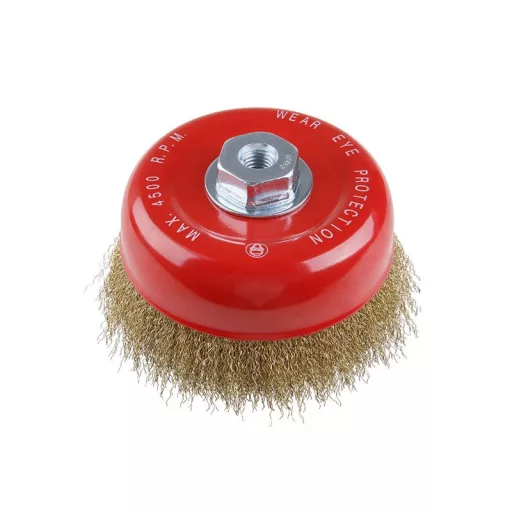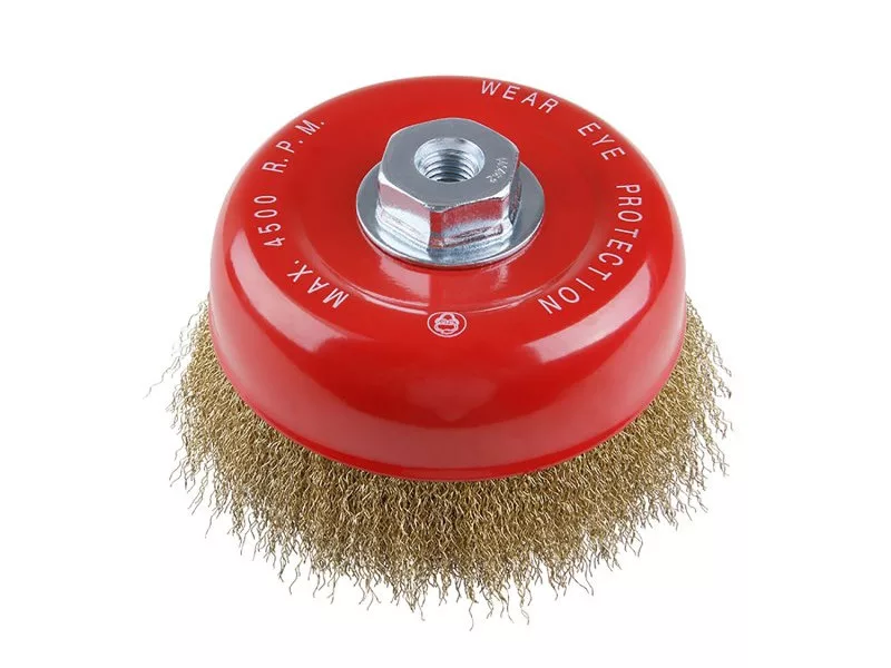 Forgókefe - csésze, FESTA kefék garantálják a kiváló minőségű anyagokat és feldolgozást, hullámos huzal - sárgaréz bevonat 0,3 mm, átmérő 150 mm, rögzítés M14*2, huzalok száma 1350, huzalhossz 23 mm, maximális fordulatszám percenként. 12500, használja: rozsda eltávolítására, festékre, polírozásra