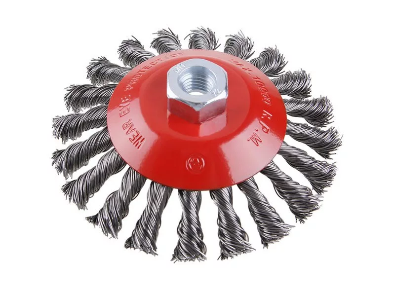 Forgókefe - csésze, kivitel: COPY - szabadalmaztatott huzal 0,5 mm - másolás, extrém terhelés mellett sem bontható ki, átmérő 125 mm, menet M14x2 mm, huzalok száma: 900, huzalhossz: 23 mm, megengedett fordulatszám: 12500 1 /perc, felhasználás: festék, rozsda, sorja, hegesztési maradványok, salak eltávolítása, érdesítés, fém alkatrészek tisztítása